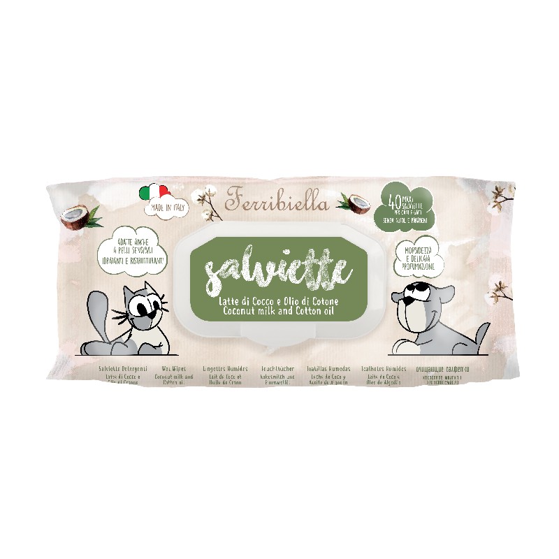 Υγρά μαντηλάκια κατοικιδίων από τη Ferribiella με άρωμα καρύδα.
