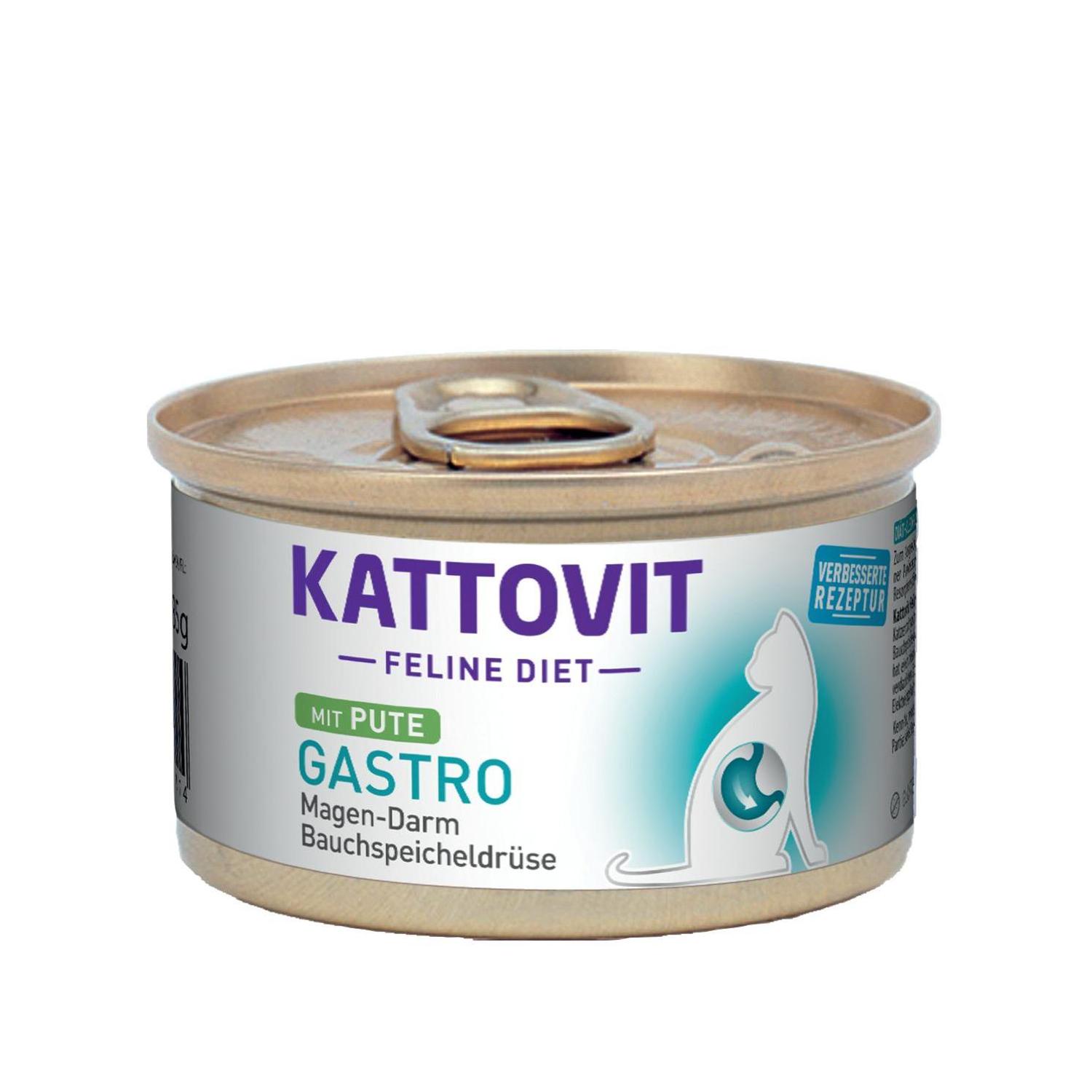Για την υποστήριξη της ανεπαρκούς πέψης και της εξωκρινής παγκρεατικής ανεπάρκειας καθώς και για την ανακούφιση των διαταραχών της εντερικής απορρόφησης. Η Kattovit Gastro Turkey αναπτύχθηκε ειδικά για γάτες με γαστρεντερικά προβλήματα (γαστρεντερικό, πάγκρεας). Η σύνθεση της είναι ιδιαίτερα εύπεπτη, χαμηλή σε λιπαρά και δεν περιέχει γλουτένη. Επιπλέον, έχει αυξημένη περιεκτικότητα σε ηλεκτρολύτες που βοηθούν την ενυδάτωση.