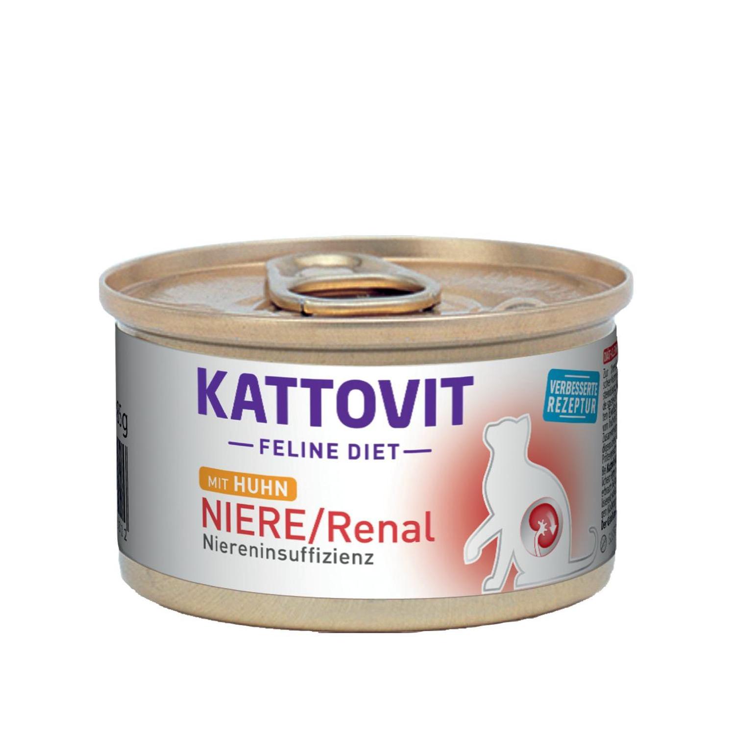 Για την υποστήριξη της νεφρικής λειτουργίας σε χρόνια νεφρική ανεπάρκεια και τη μείωση του σχηματισμού λίθων οξαλικού ασβεστίου. Η Kattovit Renal είναι μια εύπεπτη τροφή με μειωμένη περιεκτικότητα σε, υψηλής ποιότητας, πρωτεΐνες και χαμηλά επίπεδα σε νάτριο και φώσφορο. Σε αντίθεση με τις συμβατικές τροφές, μόνο περίπου η μισή ενέργεια προέρχεται από την πρωτεΐνη. Επιπλέον, είναι εμπλουτισμένη με κιτρικό κάλιο το οποίο έχει αλκαλοποιητική δράση στα ούρα και μπορεί να αποτρέψει τον σχηματισμό κρυστάλλων οξαλικού ασβεστίου.