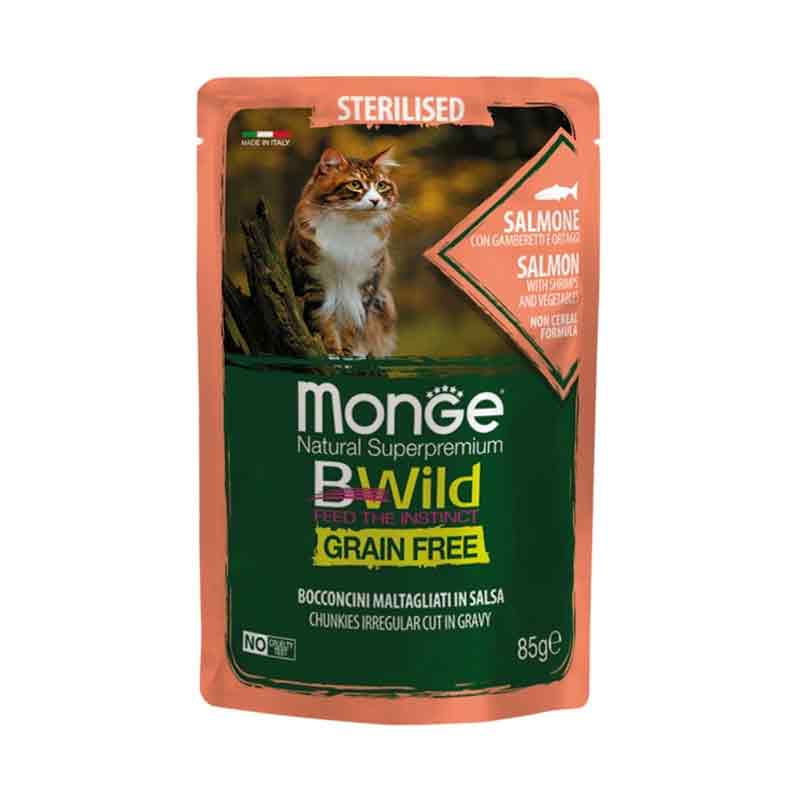 Πλήρης υγρή τροφή χωρίς σιτηρά, με σολομό, γαρίδες και λαχανικά, σε κομματάκιαΚατάλληλη για ενήλικες στειρωμένες γάτες