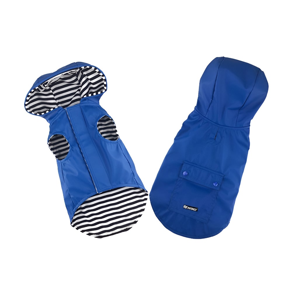 Αδιάβροχο μπουφάν σε μπλε χρώμα, με κουκούλα και ριγέ επένδυσηΚατάλληλο για όλα τα σκυλάκια