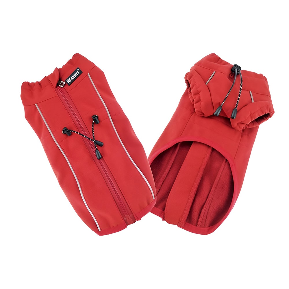 Αδιάβροχο μπουφάν σε κόκκινο χρώμα, με κουκούλα και ριγέ επένδυσηΚατάλληλο για όλα τα σκυλάκια