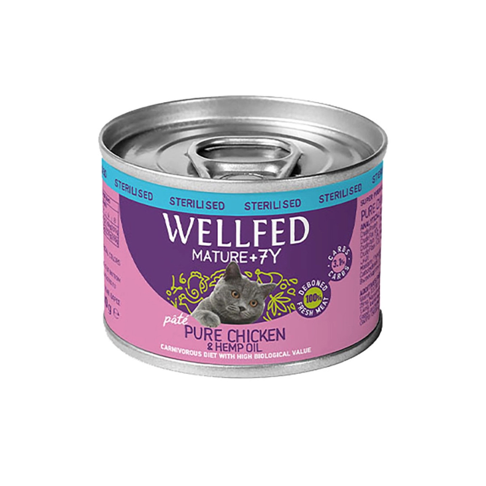 Πλήρης υγρή τροφή με κοτόπουλο και έλαιο κάνναβης, σε πατέ Κατάλληλη για στειρωμένες γάτες άνω των 7 ετών