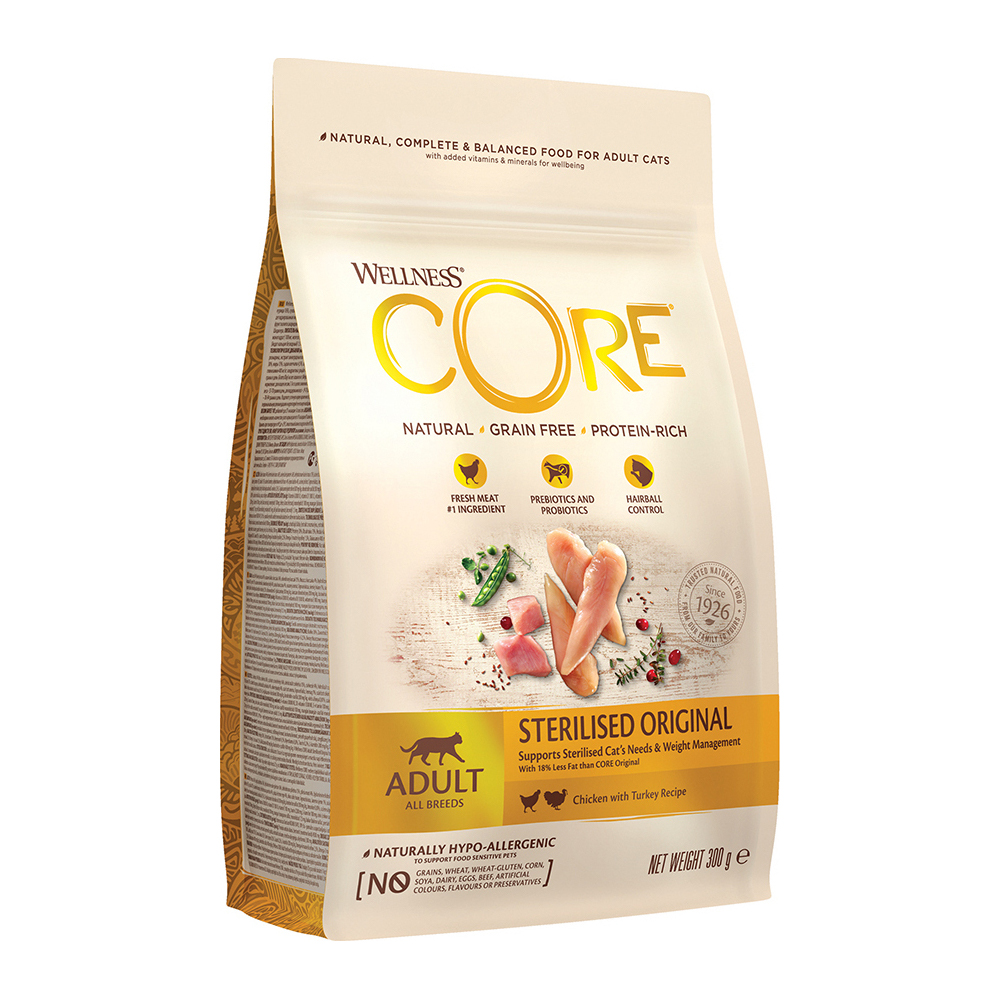 Πλήρης τροφή χωρίς σιτηρά με κοτόπουλο και γαλοπούλαΚατάλληλη για στειρωμένες γάτες